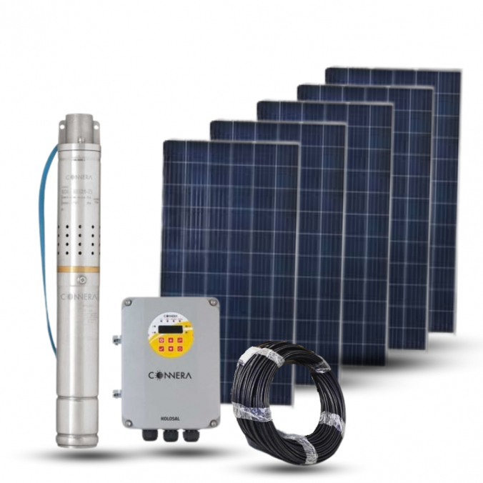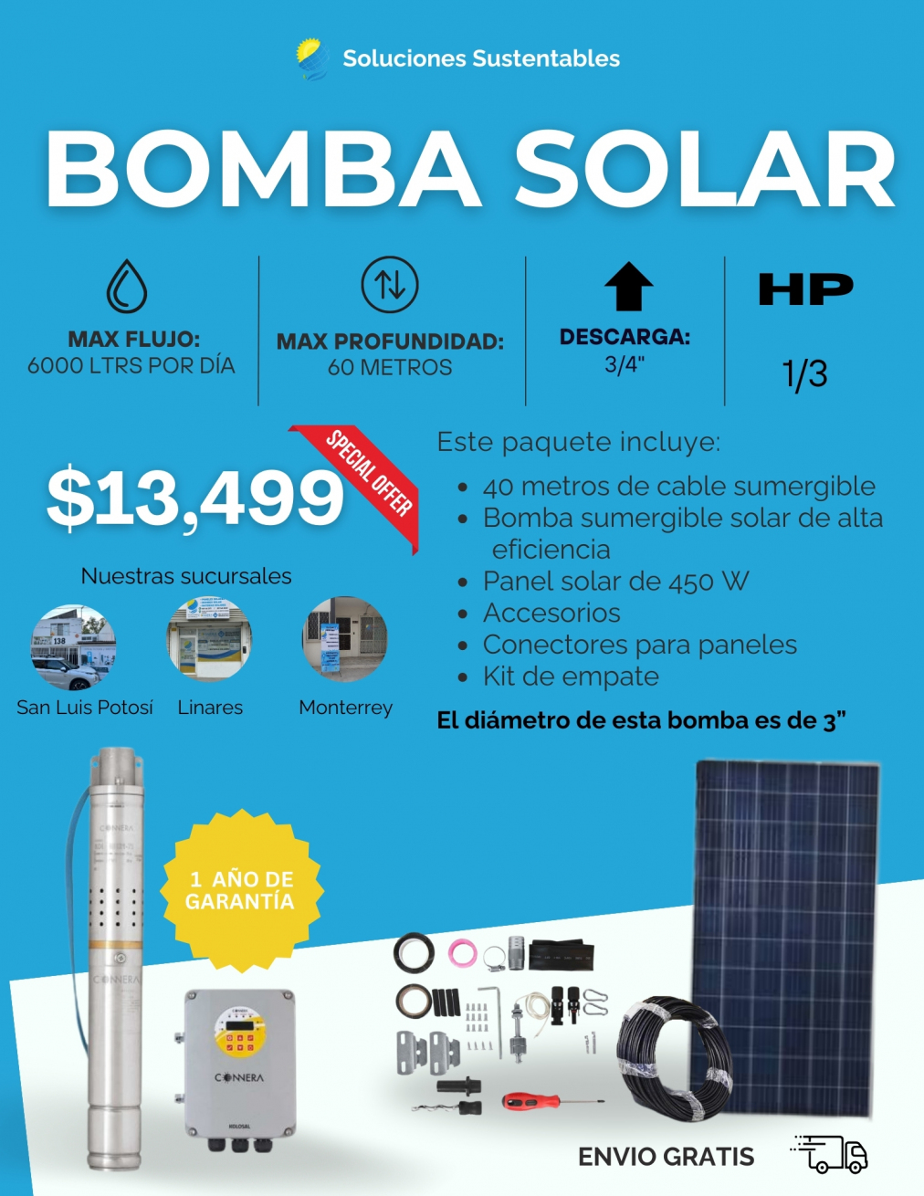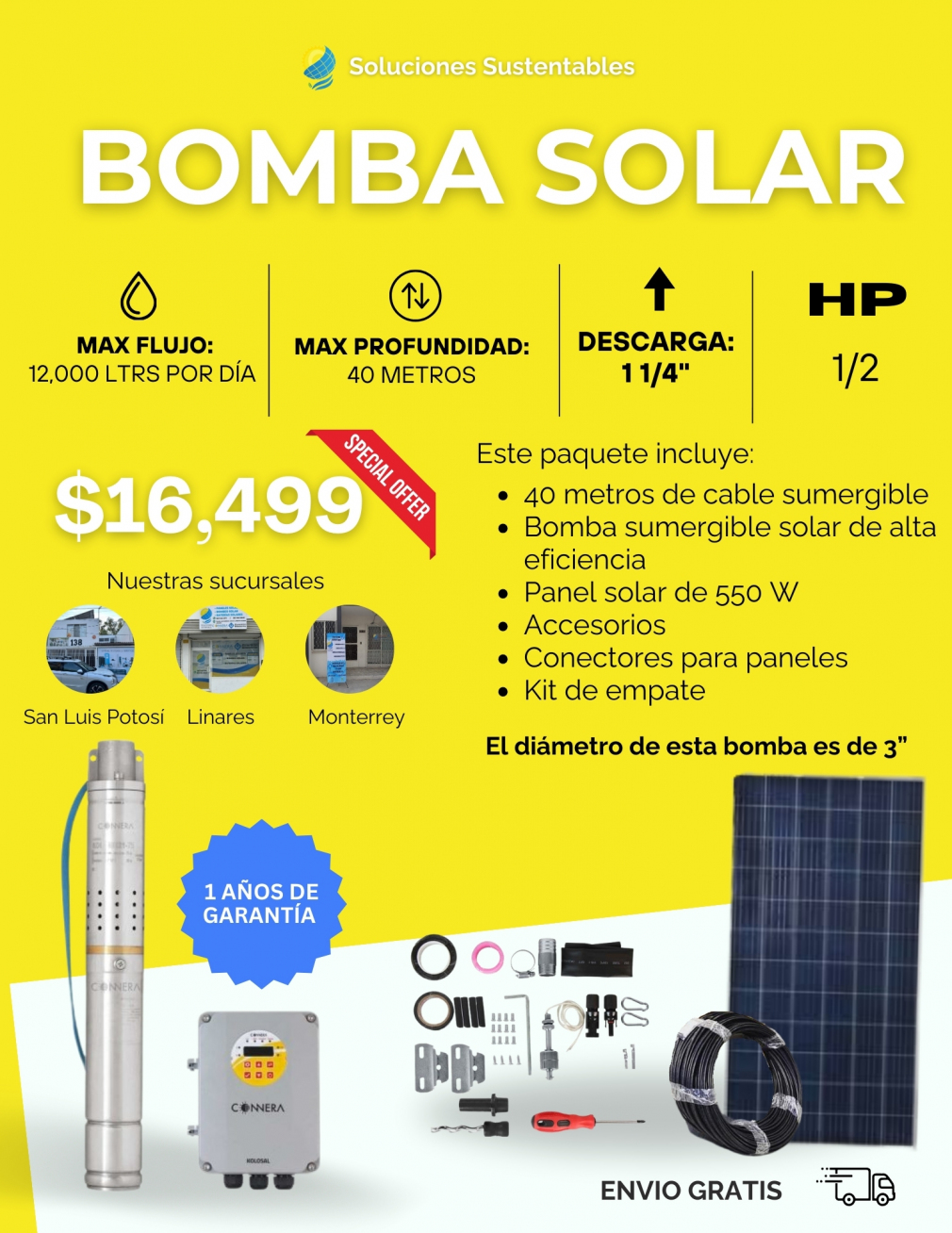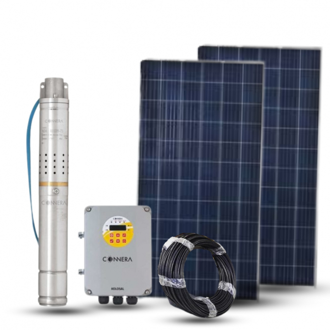 Bomba sumergible solar desde 1/3 HP hasta 3 HP. Todos los paquetes incluyen cable sumergible.
